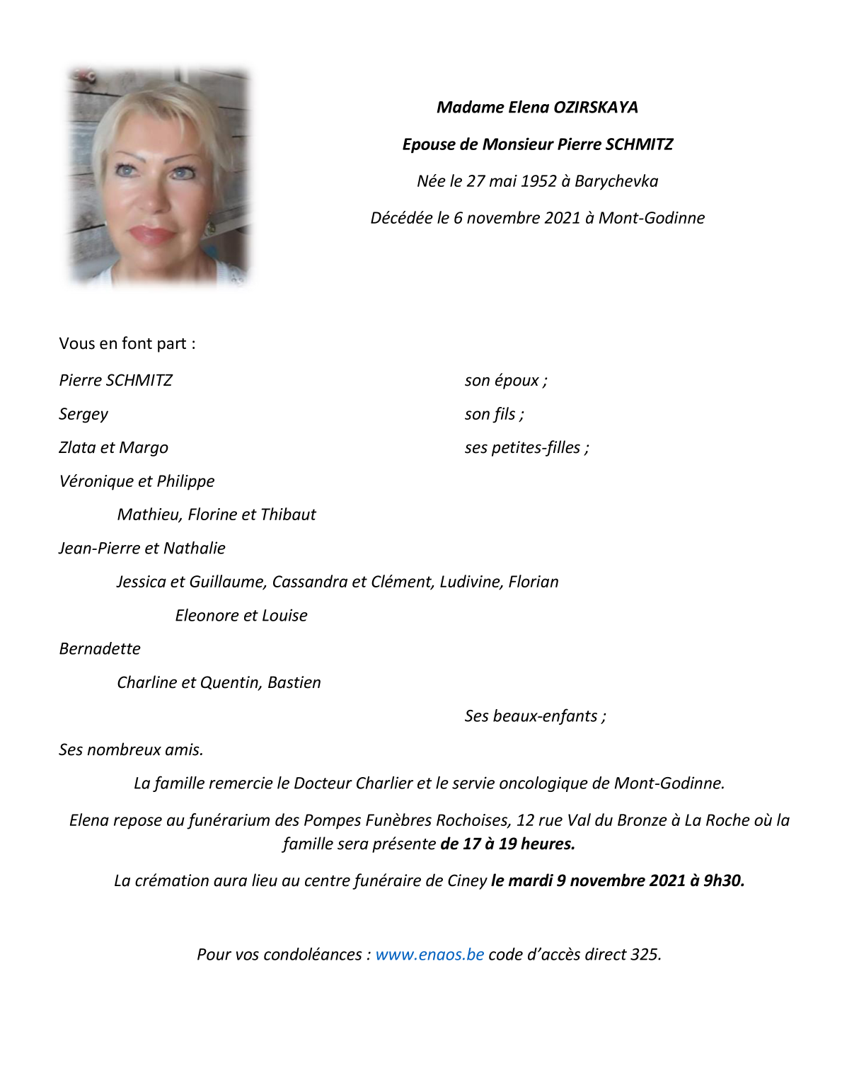 Fallecida en Godinne (5530) el sábado, 6 de noviembre de 2021 a la edad de 69 años