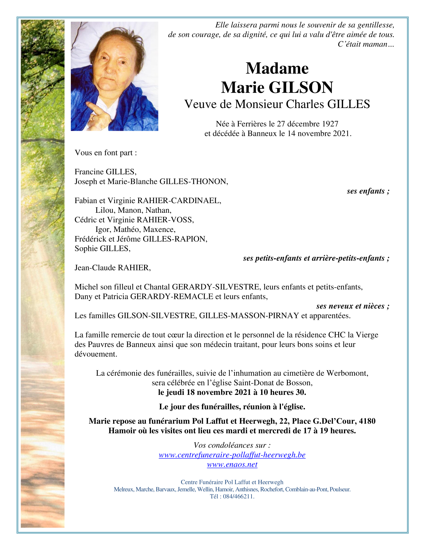 Décédée à Louveigné (4141) le dimanche 14 novembre 2021 à l'âge de 93 ans