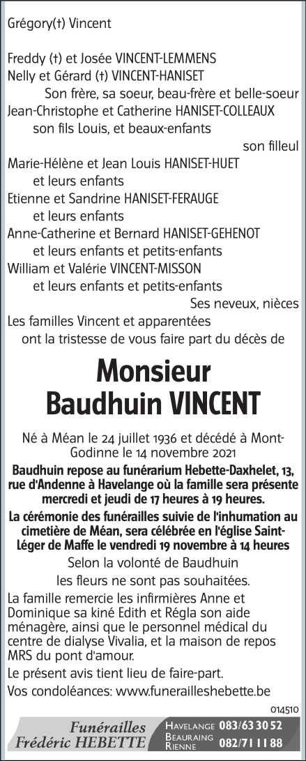 Décédé à Mont-Godinne (5530) le dimanche 14 novembre 2021 à l'âge de 85 ans
