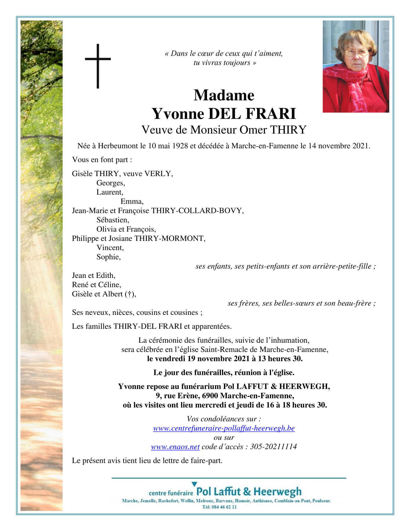 Fallecida en Marche-en-Famenne (6900) el domingo, 14 de noviembre de 2021 a la edad de 93 años