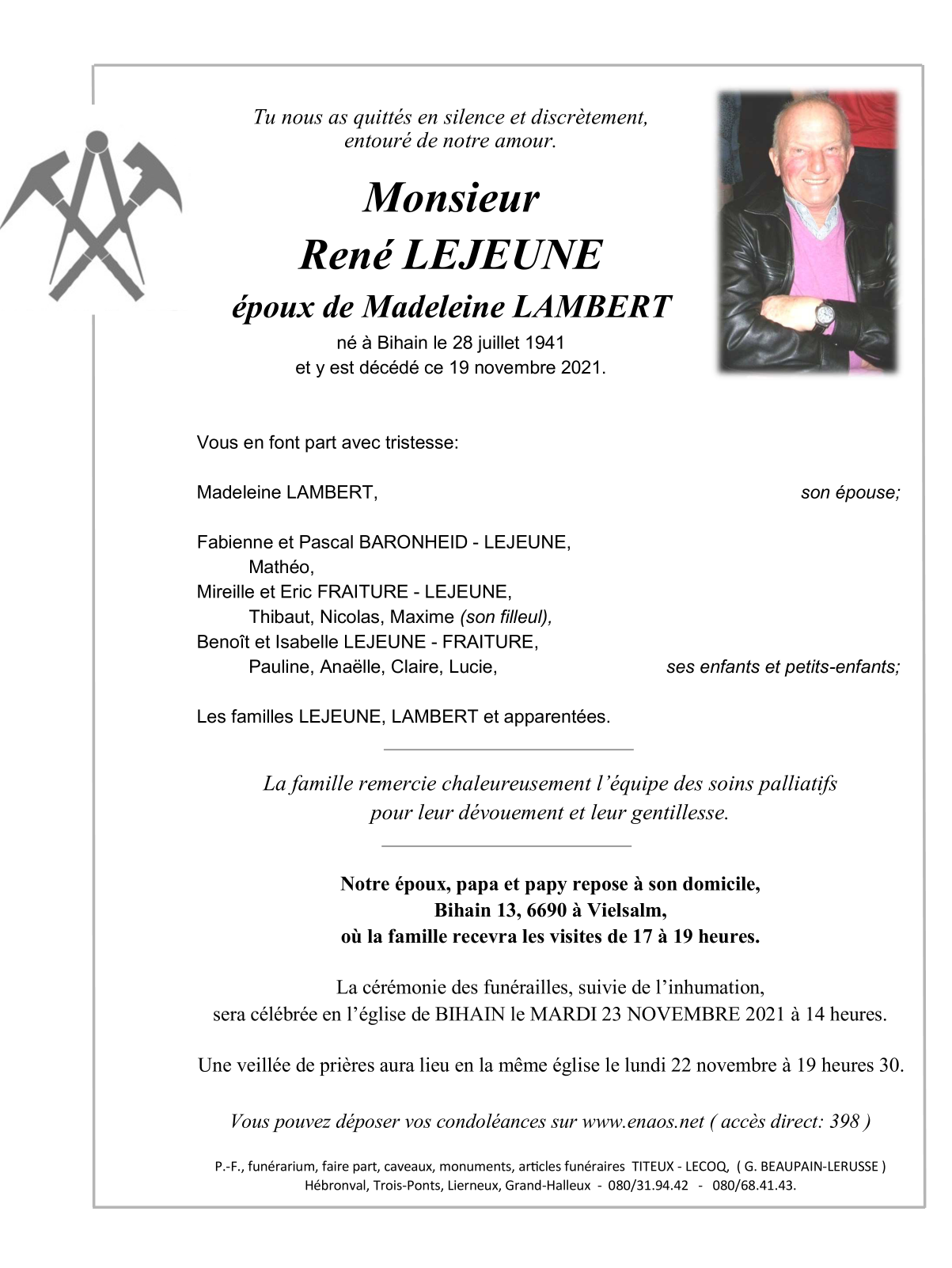Décédé à Bihain (6690) le vendredi 19 novembre 2021 à l'âge de 80 ans