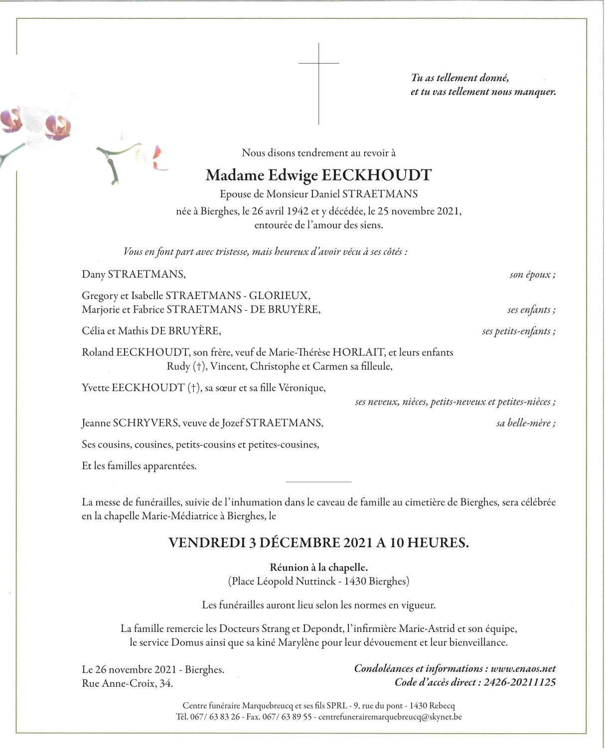 Décédée à Bierghes (1430) le jeudi 25 novembre 2021 à l'âge de 79 ans