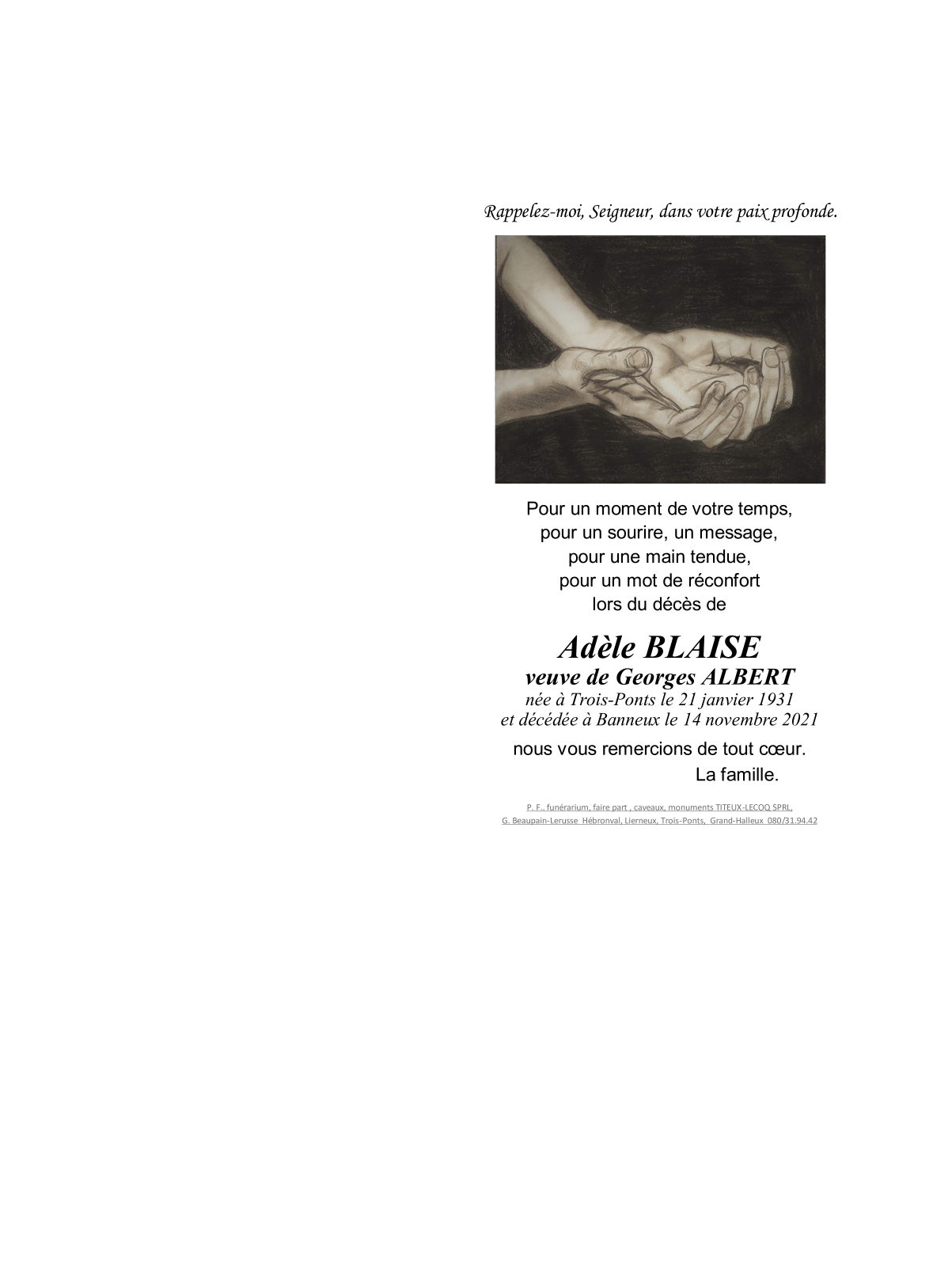 Née à Trois-Ponts (4980) le mercredi 21 janvier 1931