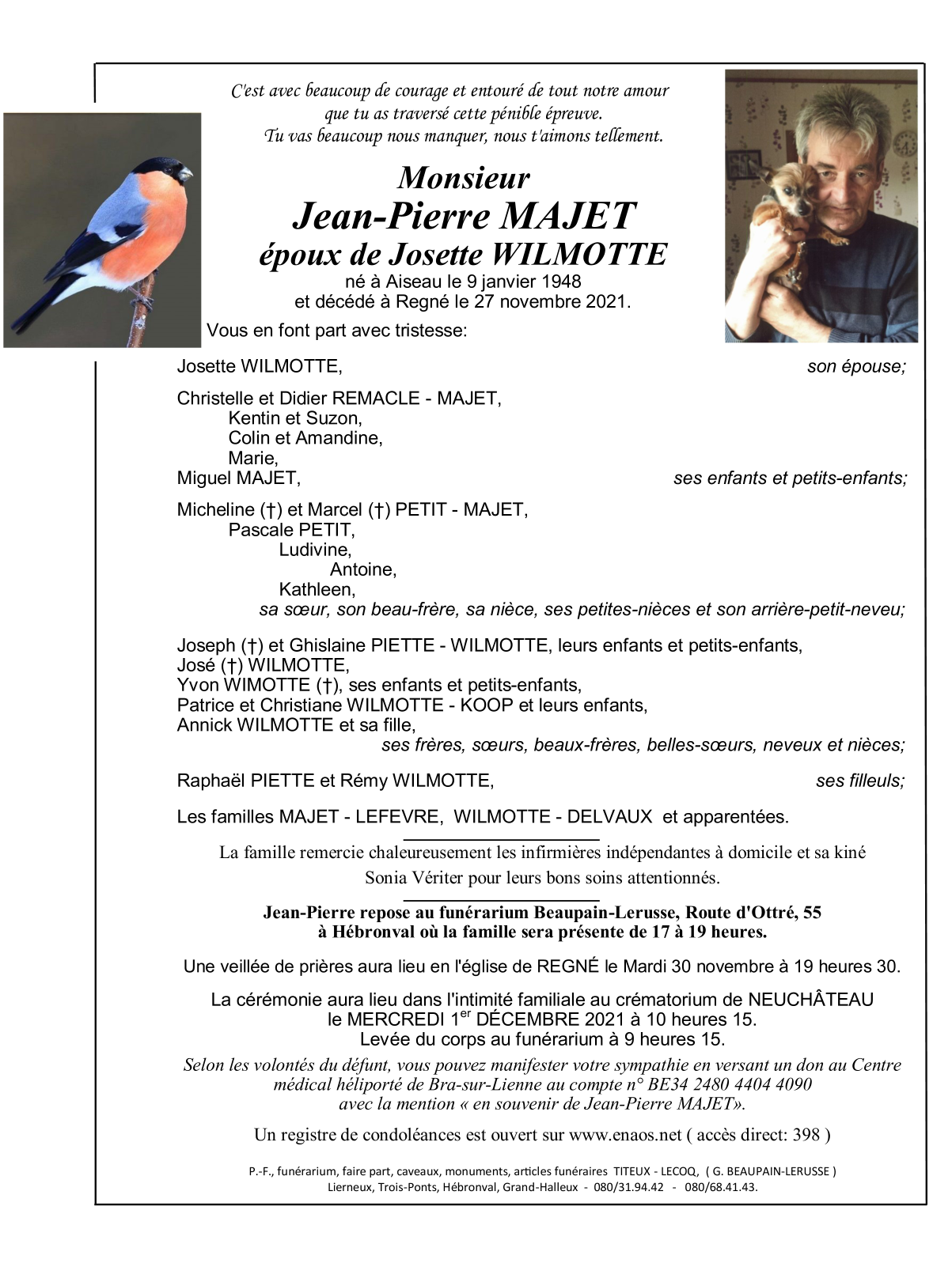 Décédé à Regné (6690) le samedi 27 novembre 2021 à l'âge de 73 ans