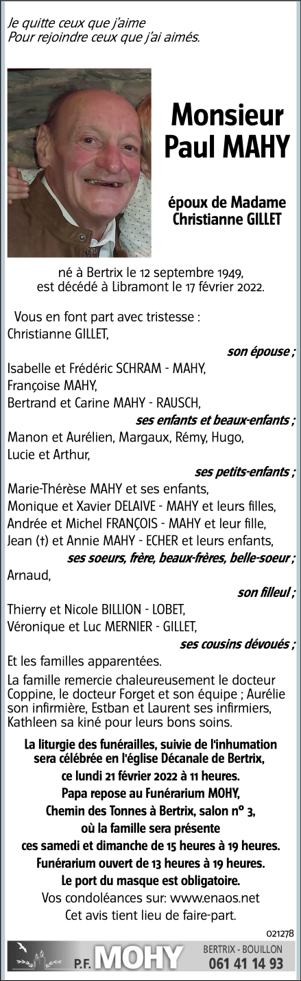 Décédé à Libramont (6800) le jeudi 17 février 2022 à l'âge de 72 ans