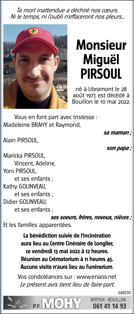 Fallecido en Bouillon (6830) el martes, 10 de mayo de 2022 a la edad de 44 años