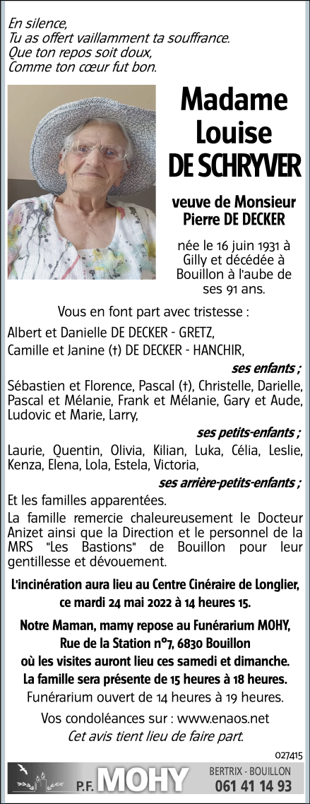 Décédée à Bouillon (6830) le vendredi 20 mai 2022 à l'âge de 90 ans