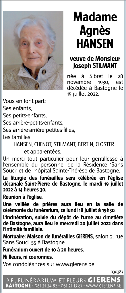 Décédée à Bastogne (6600) le vendredi 15 juillet 2022 à l'âge de 91 ans