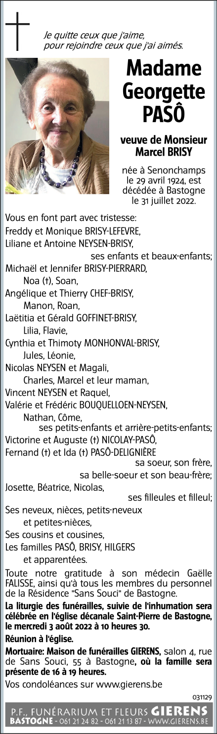 Décédée à Bastogne (6600) le dimanche 31 juillet 2022 à l'âge de 98 ans