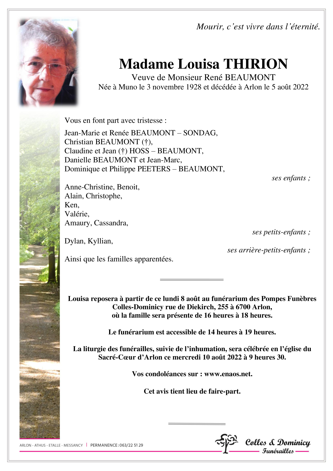 Décédée à Arlon (6700) le vendredi 5 août 2022 à l'âge de 93 ans