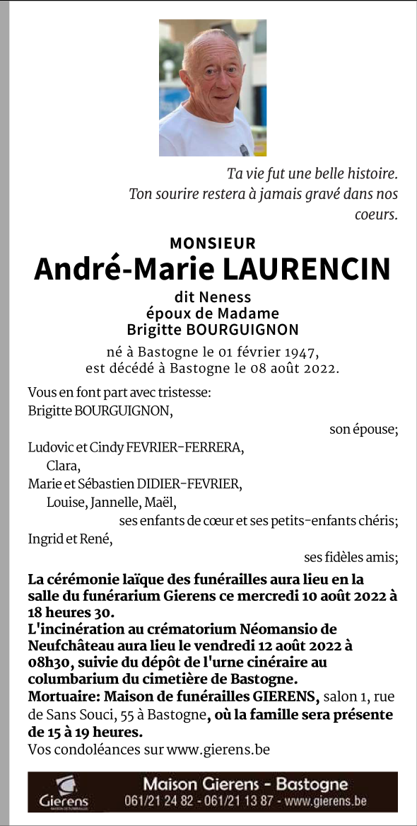 Décédé à Bastogne (6600) le lundi 8 août 2022 à l'âge de 75 ans
