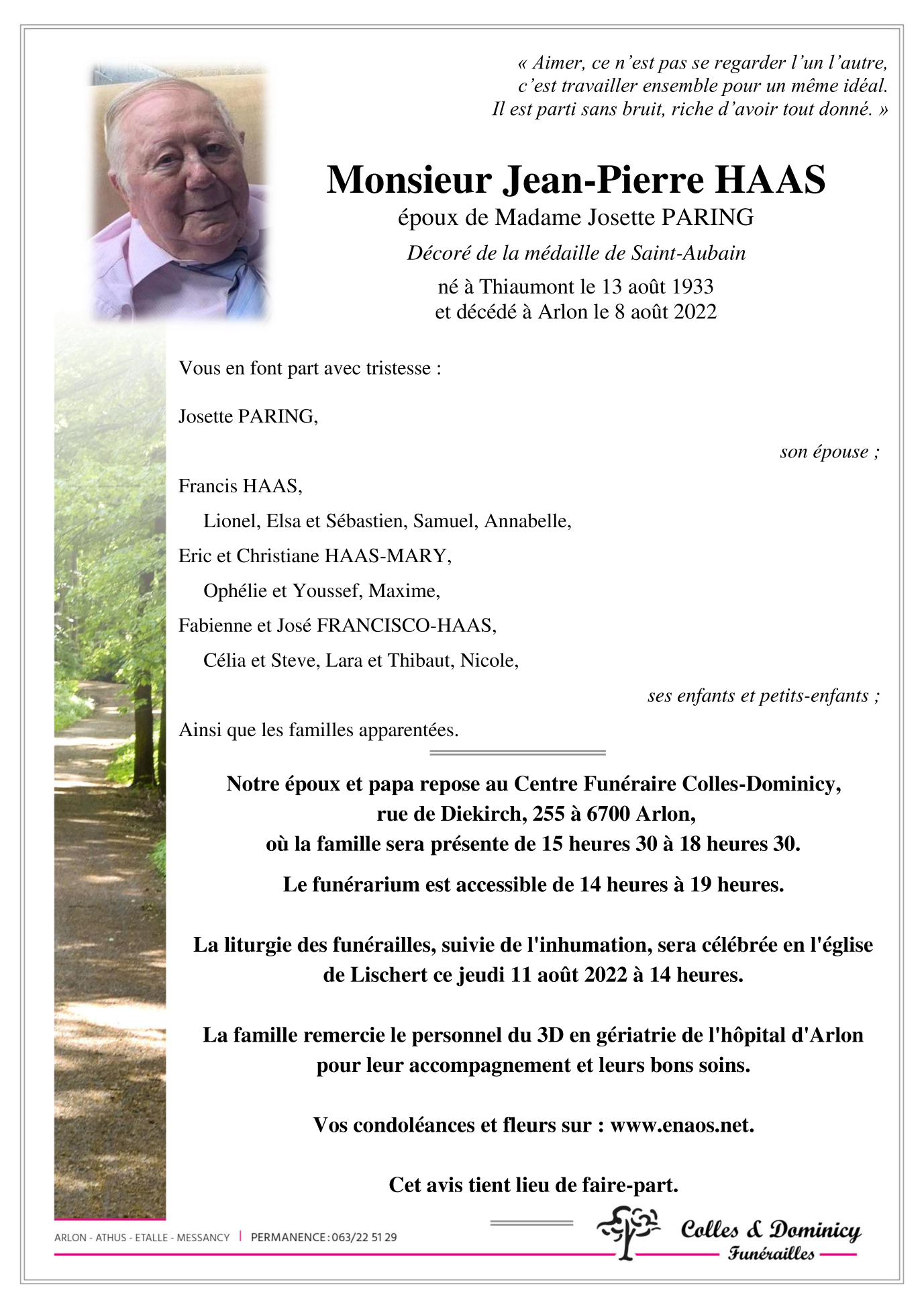 Fallecido en Arlon (6700) el lunes, 8 de agosto de 2022 a la edad de 88 años