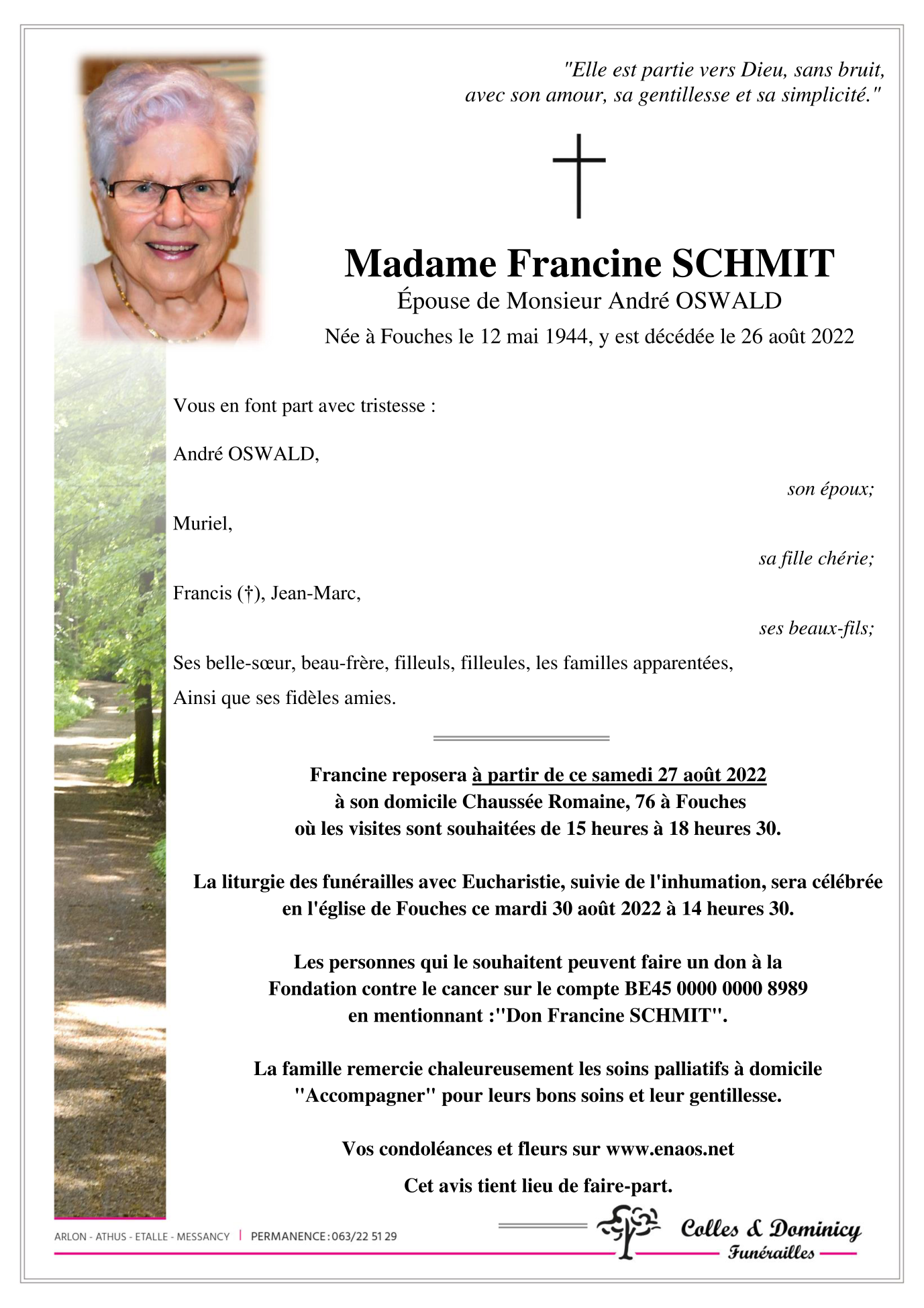 Décédée à Fouches (6700) le vendredi 26 août 2022 à l'âge de 78 ans