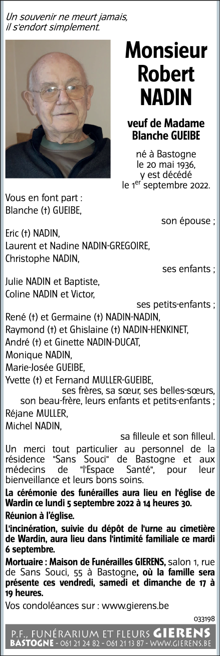 Décédé à Bastogne (6600) le jeudi 1 septembre 2022 à l'âge de 86 ans