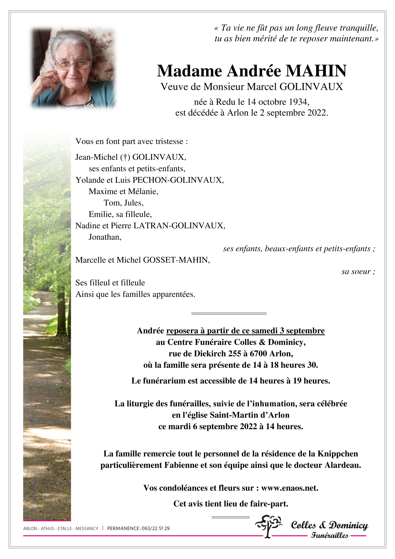 Décédée à Arlon (6700) le vendredi 2 septembre 2022 à l'âge de 87 ans