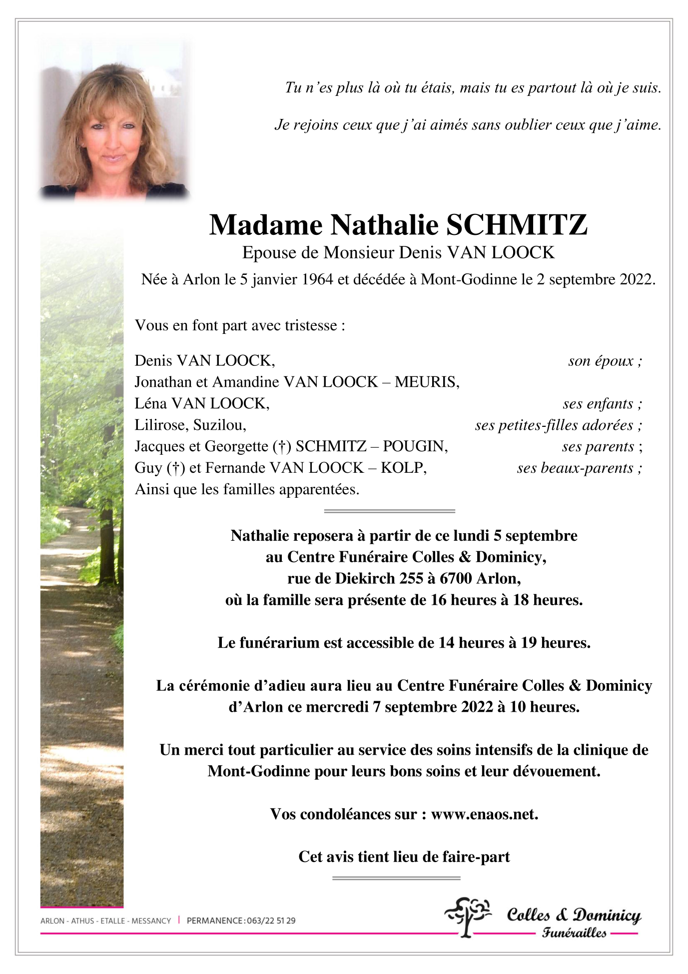 Décédée à Yvoir (5530) le vendredi 2 septembre 2022 à l'âge de 58 ans