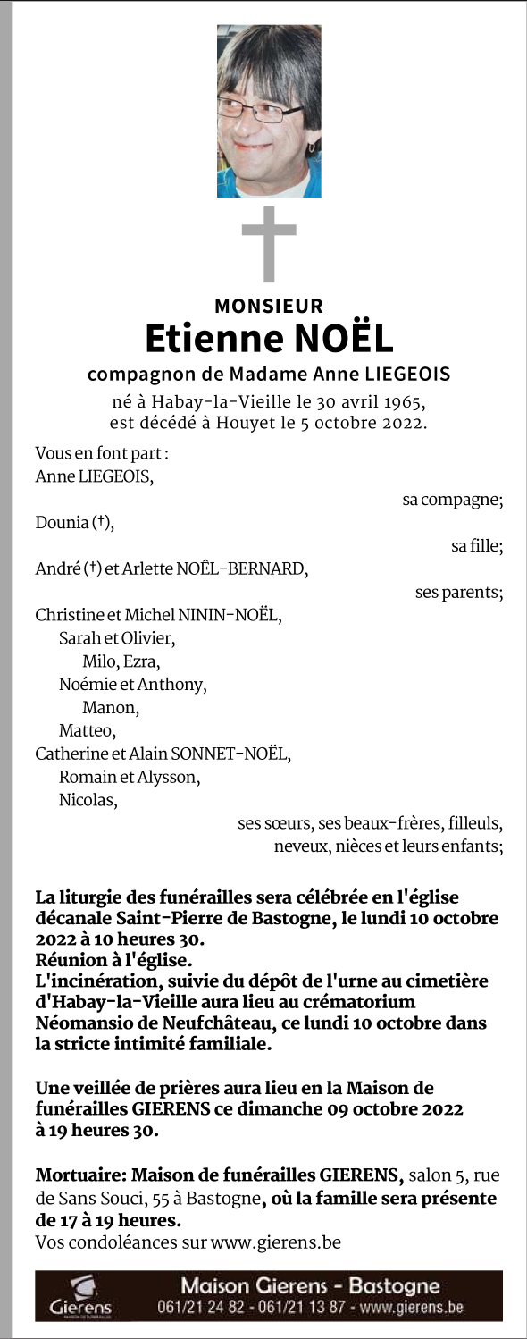 Décédé à Houyet (5560) le mercredi 5 octobre 2022 à l'âge de 57 ans