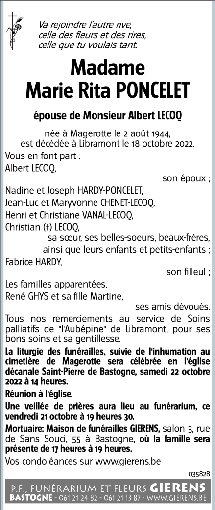 Née à Magerotte (6680) le mercredi 2 août 1944