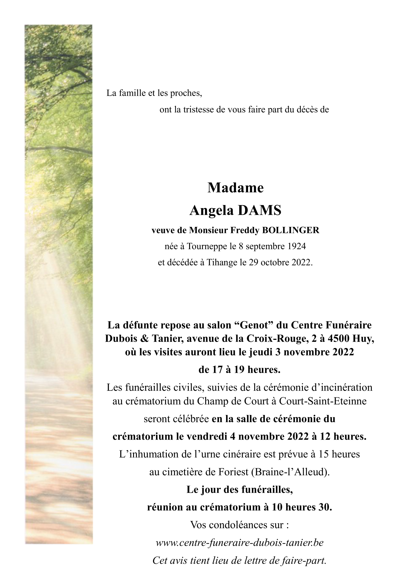 Décédée à Tihange (4500) le samedi 29 octobre 2022 à l'âge de 98 ans