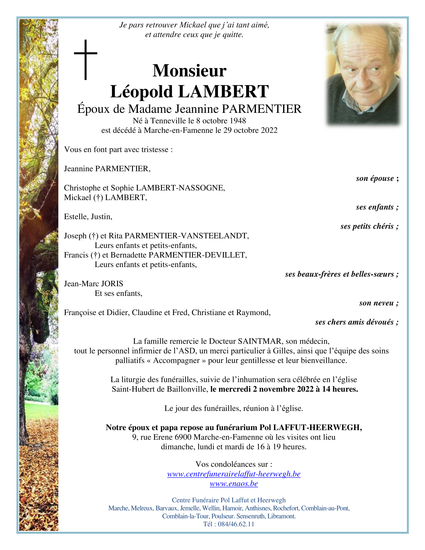 Décédé à Marche-en-Famenne (6900) le samedi 29 octobre 2022 à l'âge de 74 ans