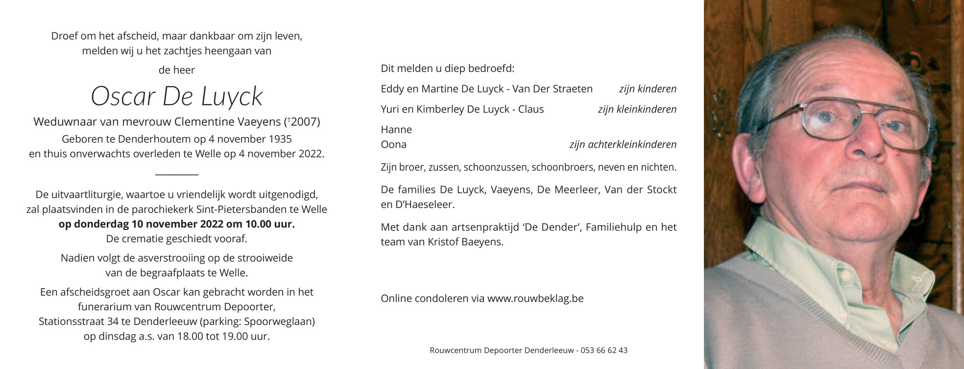 Décédé à Welle (9473) le vendredi 4 novembre 2022 à l'âge de 87 ans