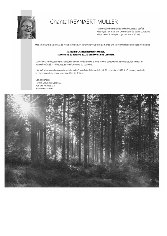 Décédée à Woluwe-Saint-Lambert (1200) le jeudi 20 octobre 2022 à l'âge de 99 ans