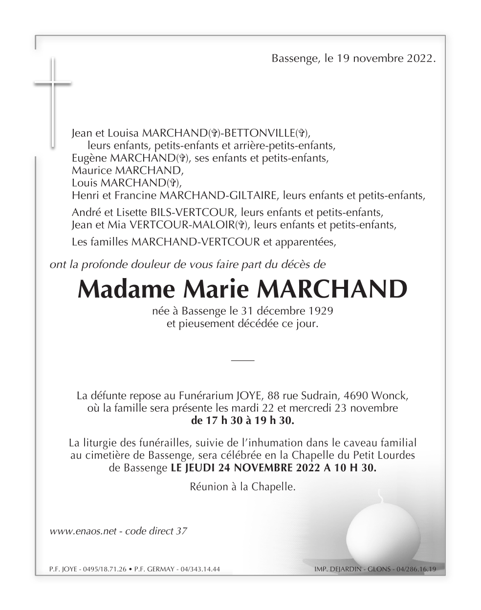 Décédée à Glons (4690) le samedi 19 novembre 2022 à l'âge de 92 ans