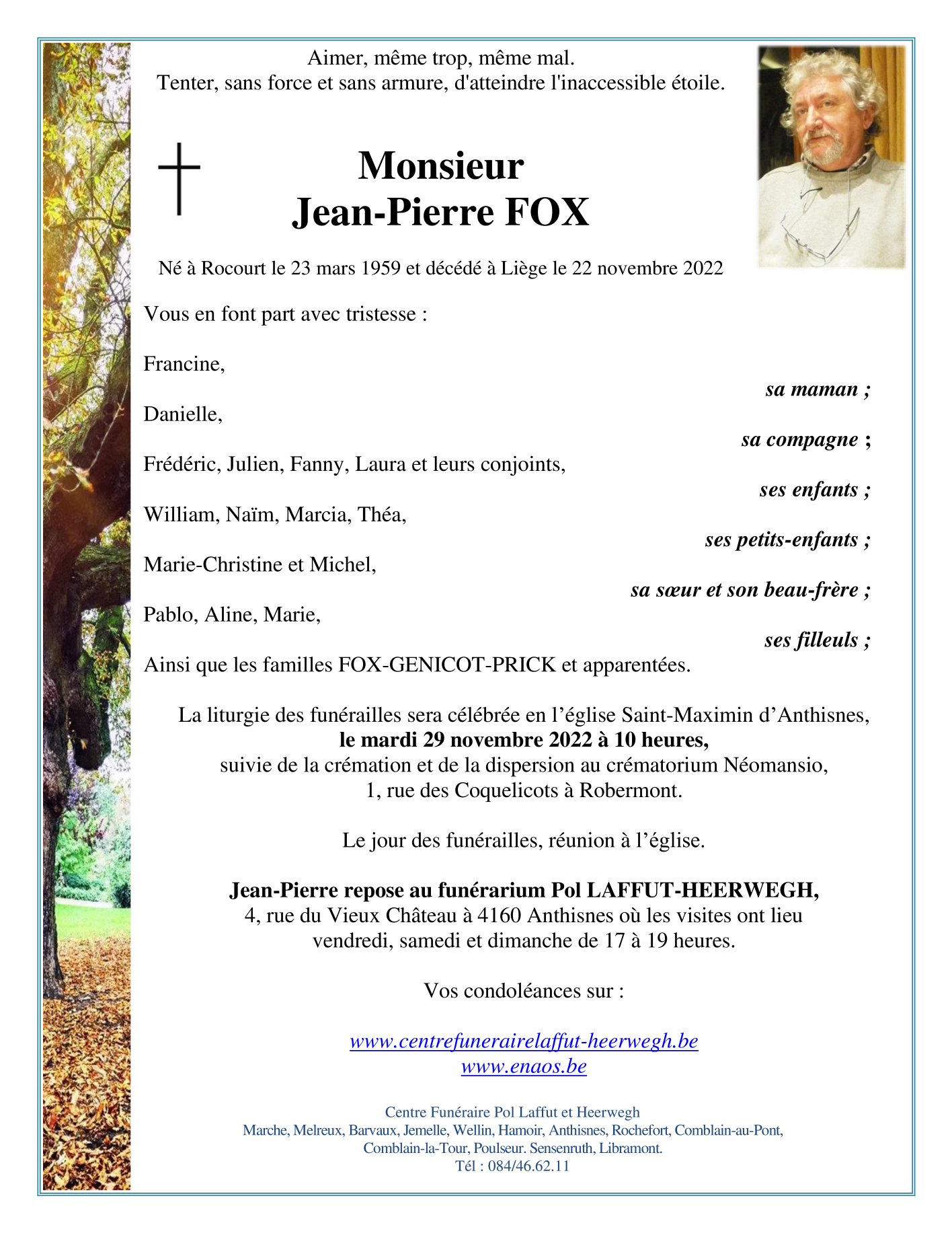Décédé à Liège (4000) le mardi 22 novembre 2022 à l'âge de 63 ans