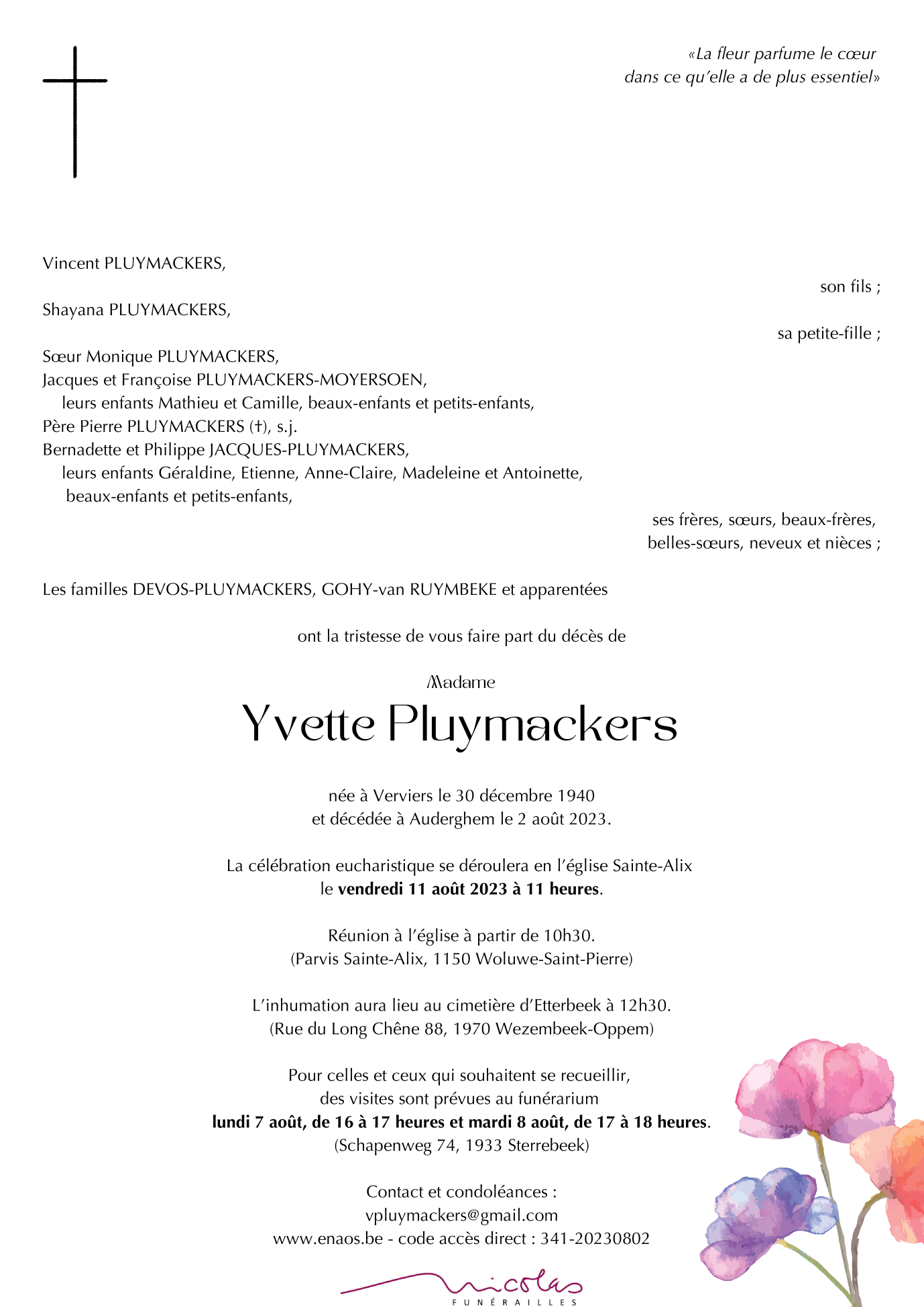 Décédée à Auderghem (1160) le mercredi 2 août 2023 à l'âge de 82 ans