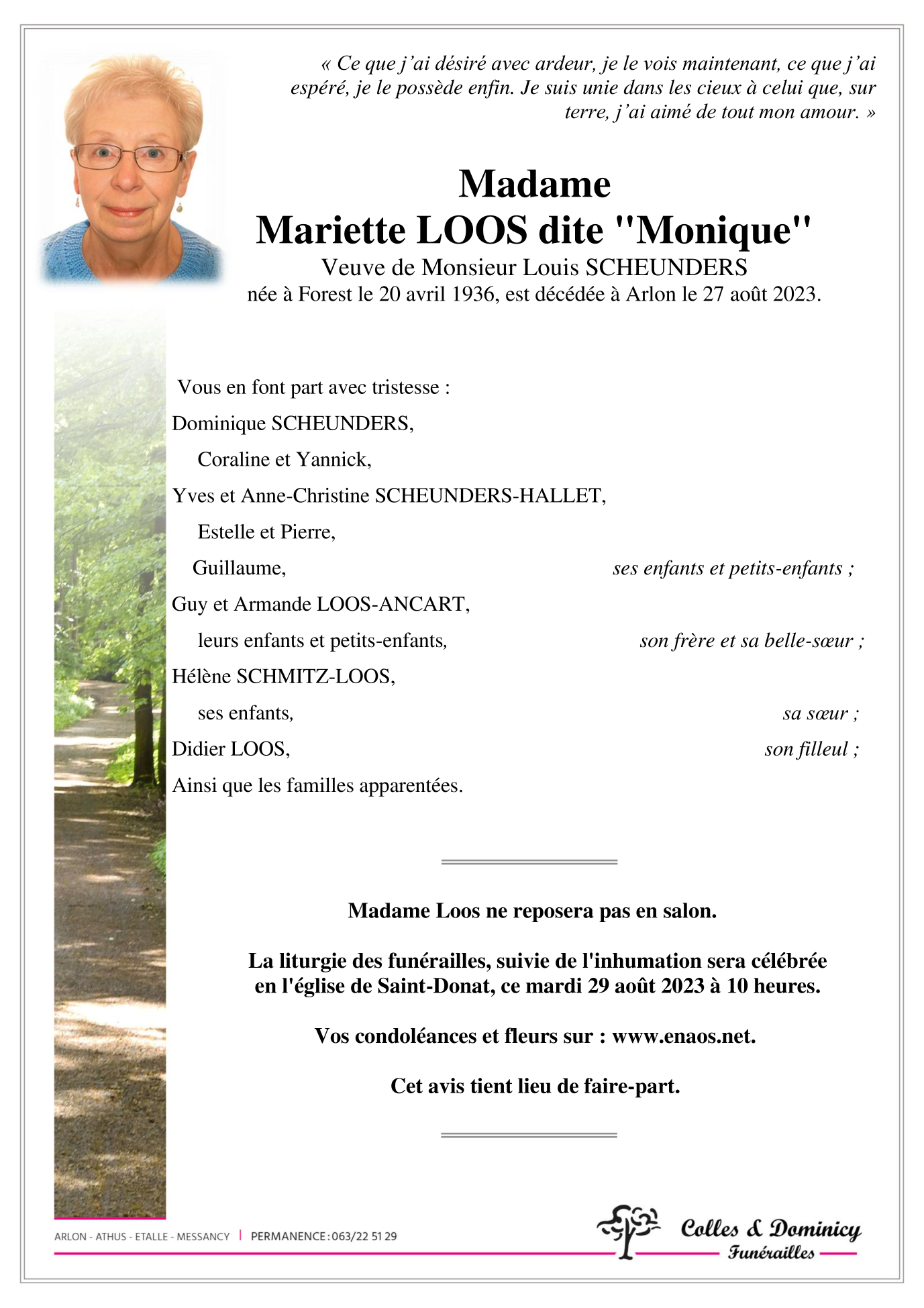 Décédée à Arlon (6700) le dimanche 27 août 2023 à l'âge de 87 ans