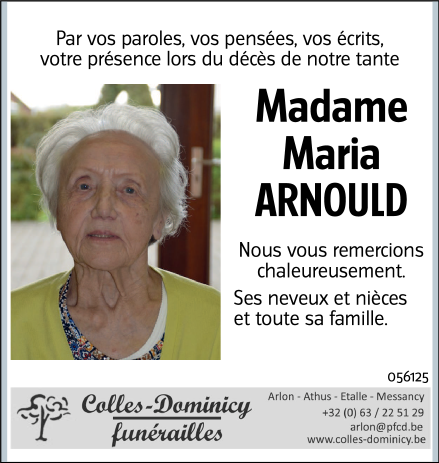 Décédée à Saint-Mard (6762) le vendredi 1 septembre 2023 à l'âge de 92 ans