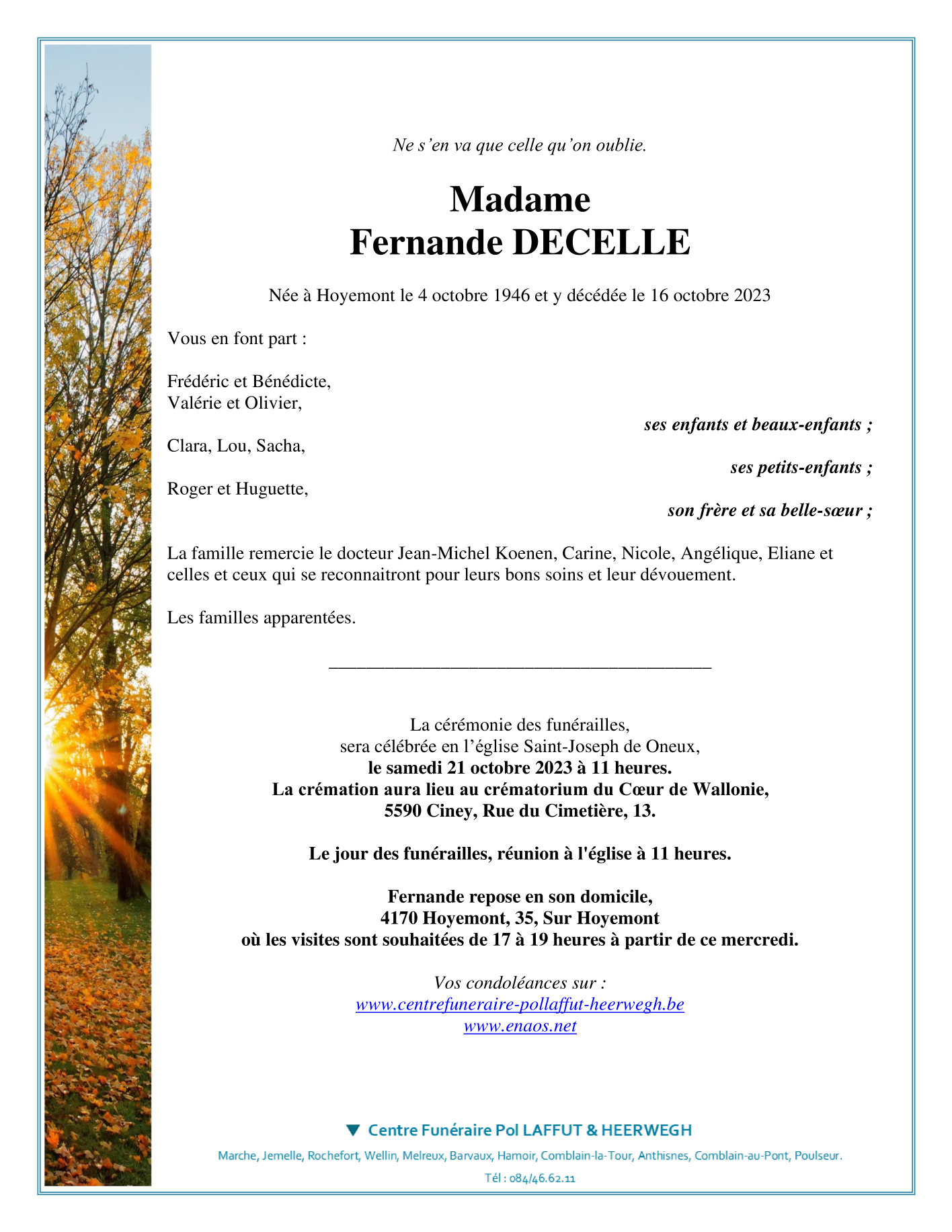 Décédée à Hoyemont (4170) le lundi 16 octobre 2023 à l'âge de 77 ans