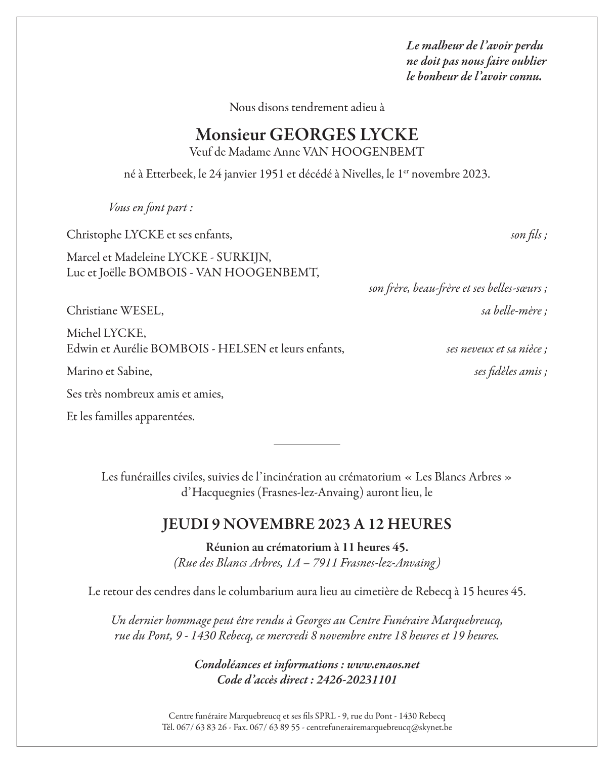 Décédé à Nivelles (1400) le mercredi 1 novembre 2023 à l'âge de 72 ans