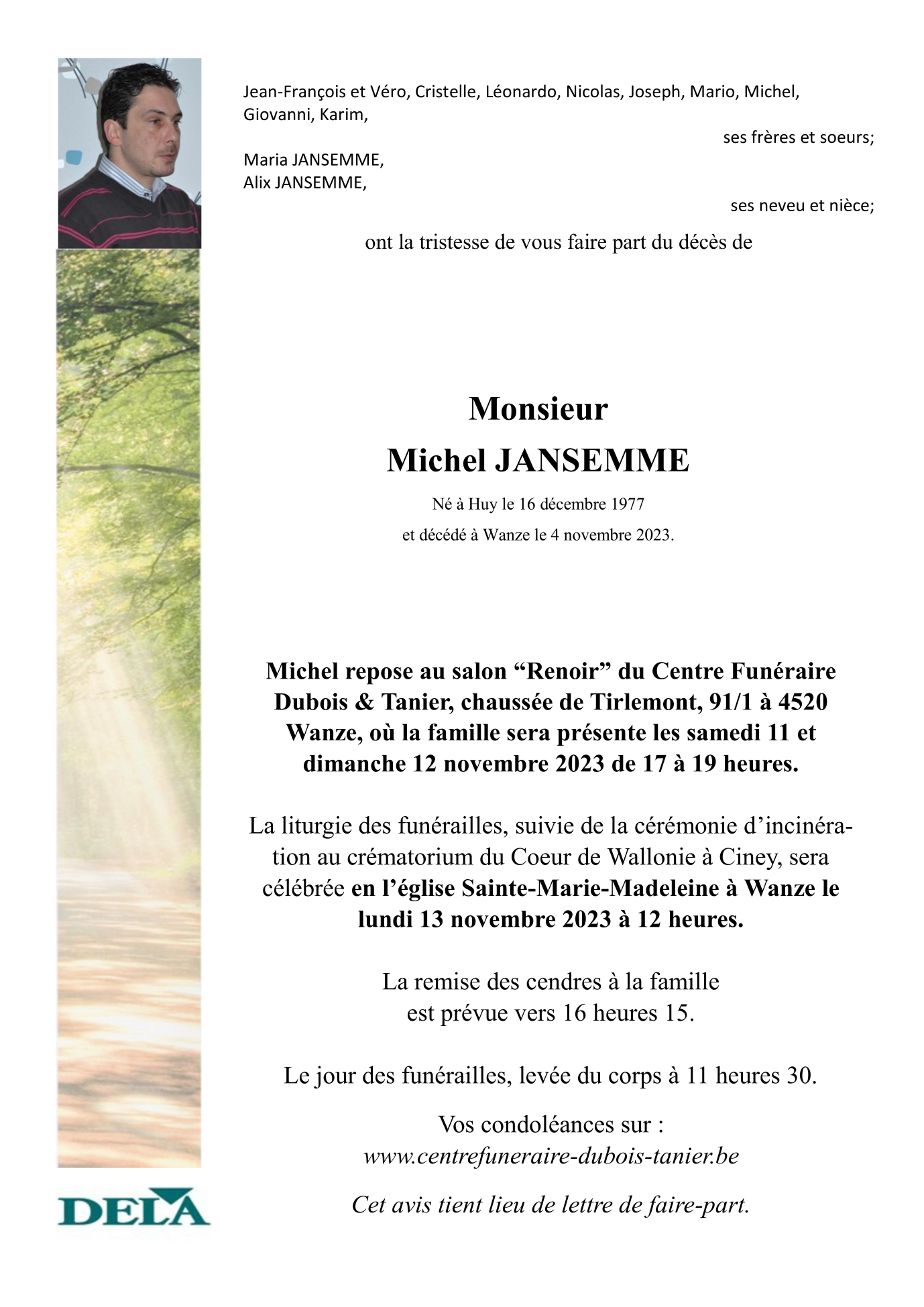 Décédé à Wanze (4520) le samedi 4 novembre 2023 à l'âge de 45 ans