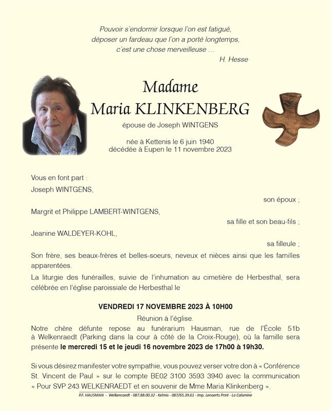 Fallecida en Eupen (4700) el sábado, 11 de noviembre de 2023 a la edad de 83 años
