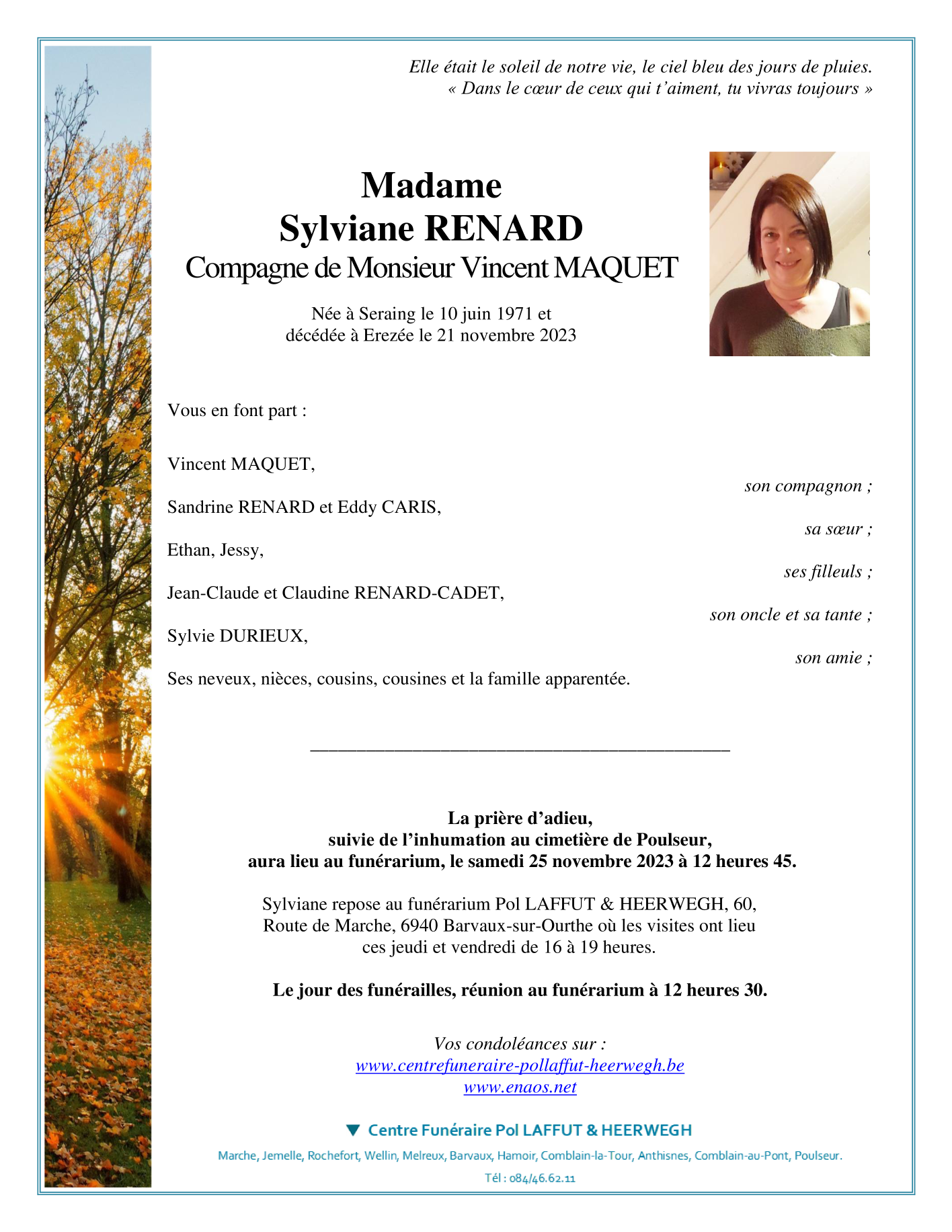 Décédée à Erezée (6997) le mardi 21 novembre 2023 à l'âge de 52 ans