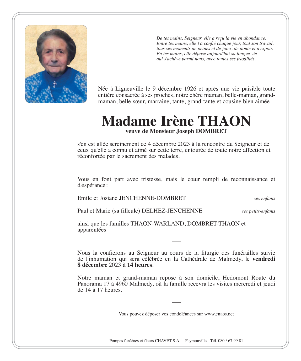 Décédée à Hédomont (4960) le lundi 4 décembre 2023 à l'âge de 96 ans