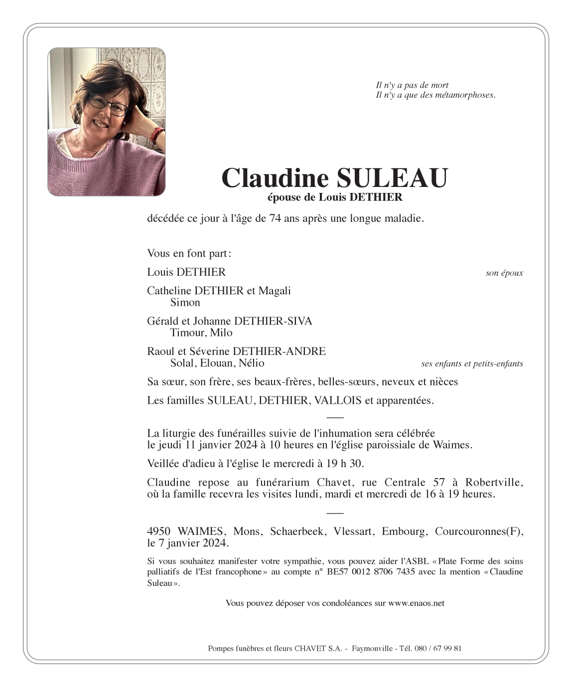 Décédée à Waimes (4950) le dimanche 7 janvier 2024 à l'âge de 74 ans