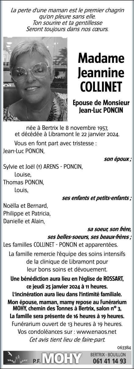 Décédée à Libramont (6800) le lundi 22 janvier 2024 à l'âge de 66 ans