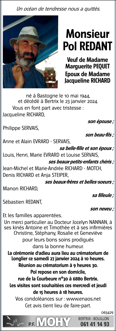 Décédé à Bertrix (6880) le mardi 23 janvier 2024 à l'âge de 79 ans