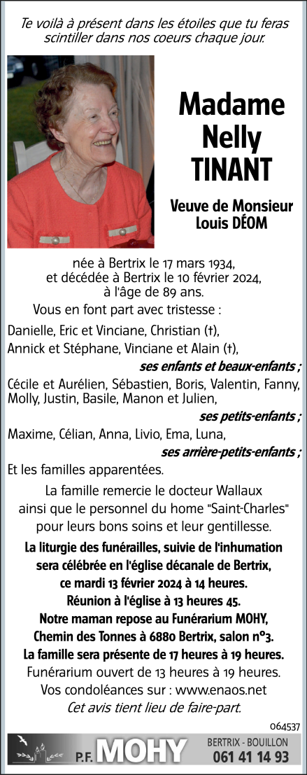 Décédée à Bertrix (6880) le samedi 10 février 2024 à l'âge de 89 ans
