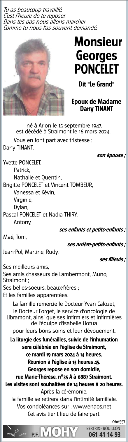 Décédé à Straimont (6887) le samedi 16 mars 2024 à l'âge de 76 ans