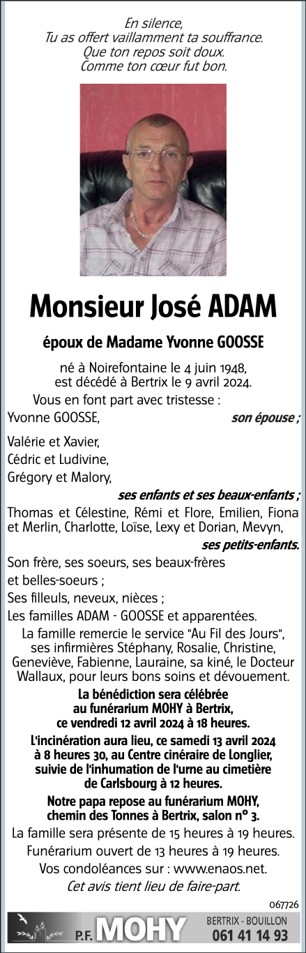 Décédé à Bertrix (6880) le mardi 9 avril 2024 à l'âge de 75 ans