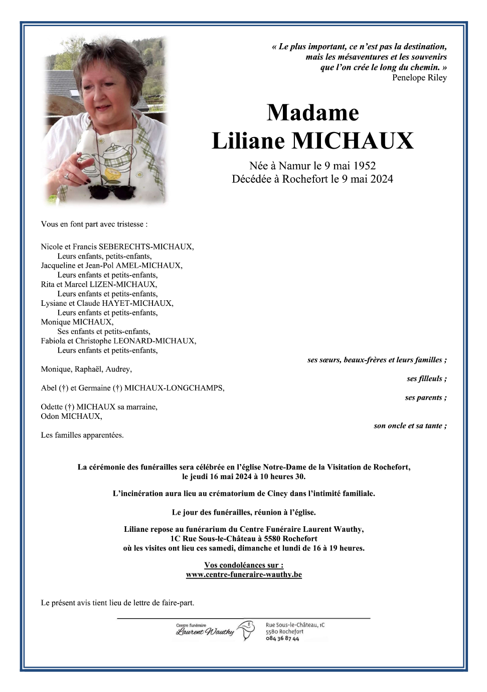 Décédée à Rochefort (5580) le jeudi 9 mai 2024 à l'âge de 72 ans