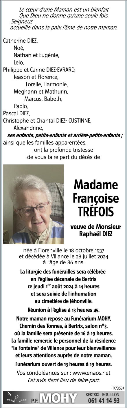 Décédée à Villance (6890) le dimanche 28 juillet 2024 à l'âge de 86 ans