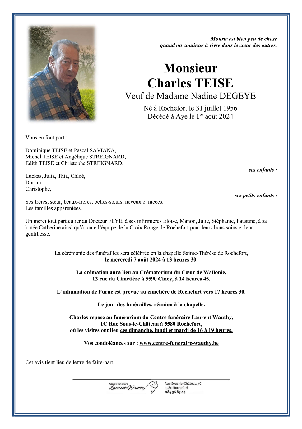 Né à Rochefort (5580) le mardi 31 juillet 1956