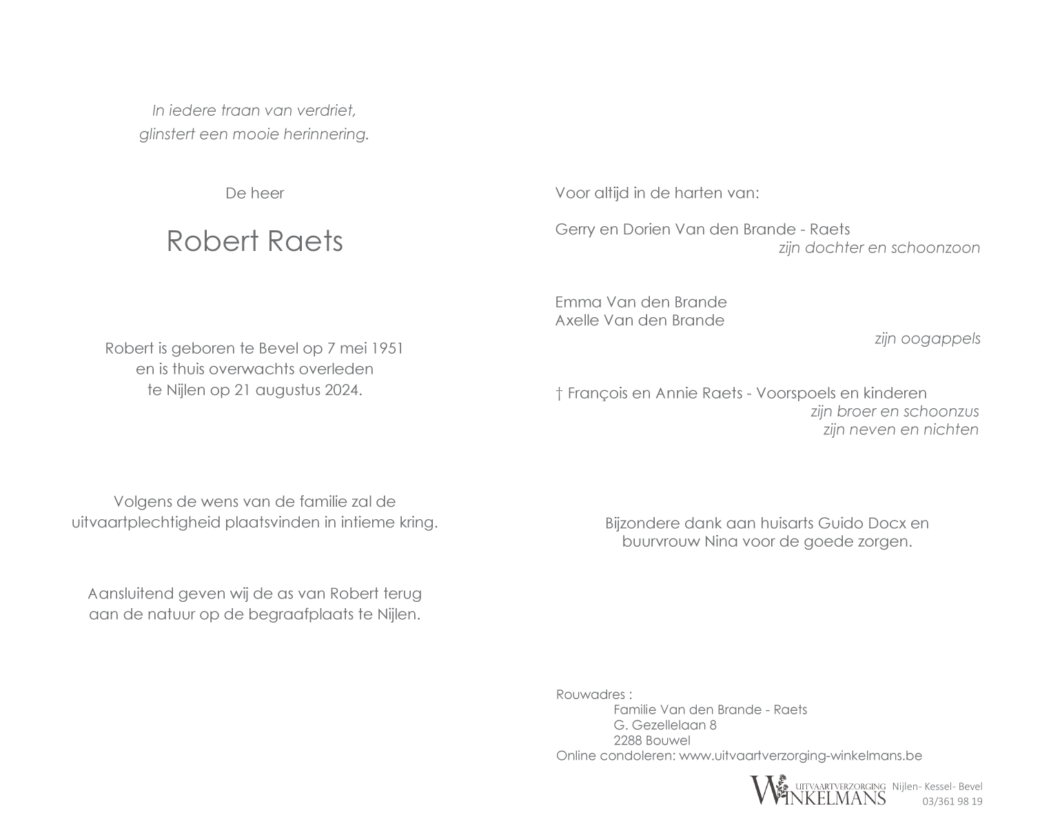 Died in Nijlen (2560) on 21 August 2024 at the age of 73 years