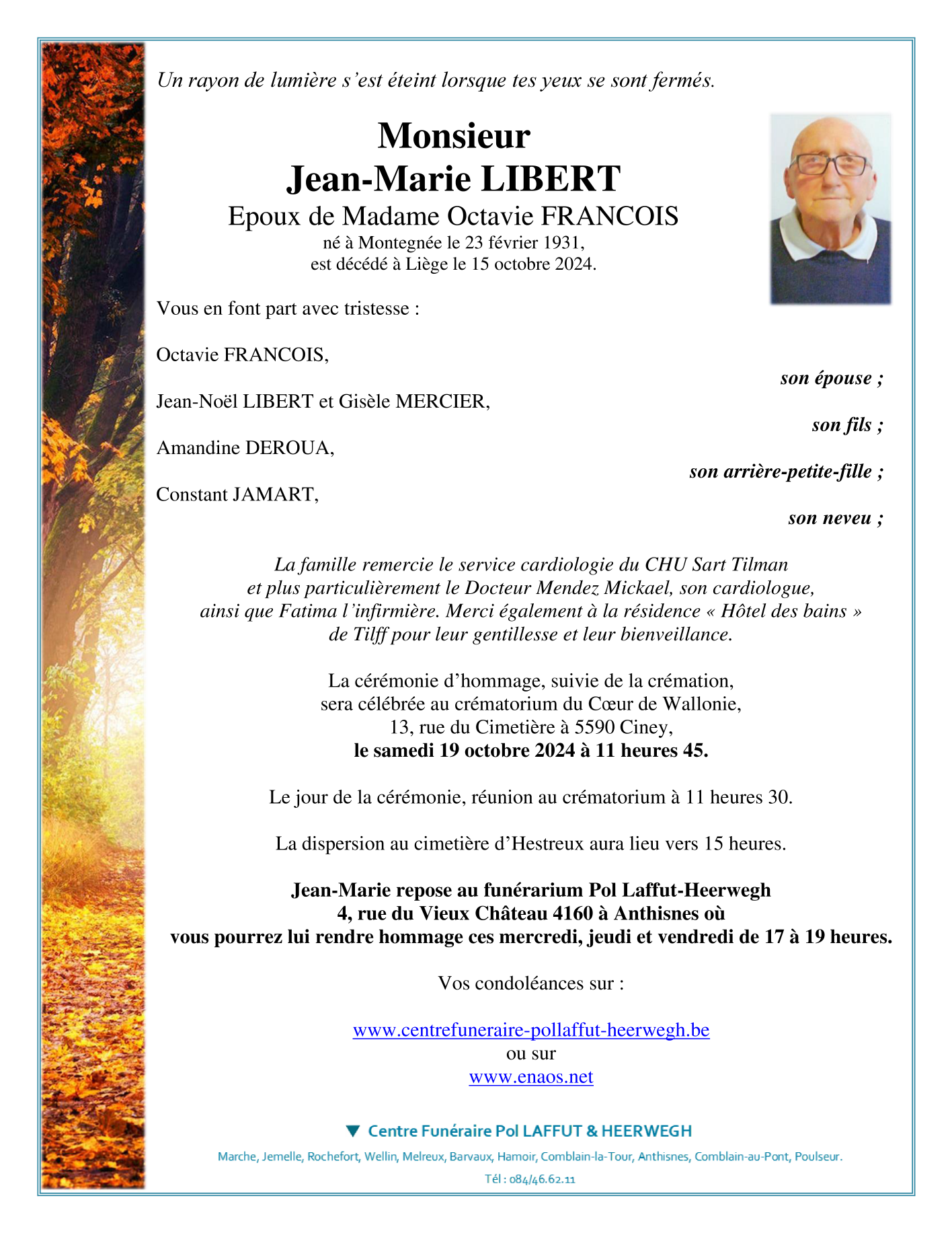 Décédé à Tilff (4130) le mardi 15 octobre 2024 à l'âge de 93 ans