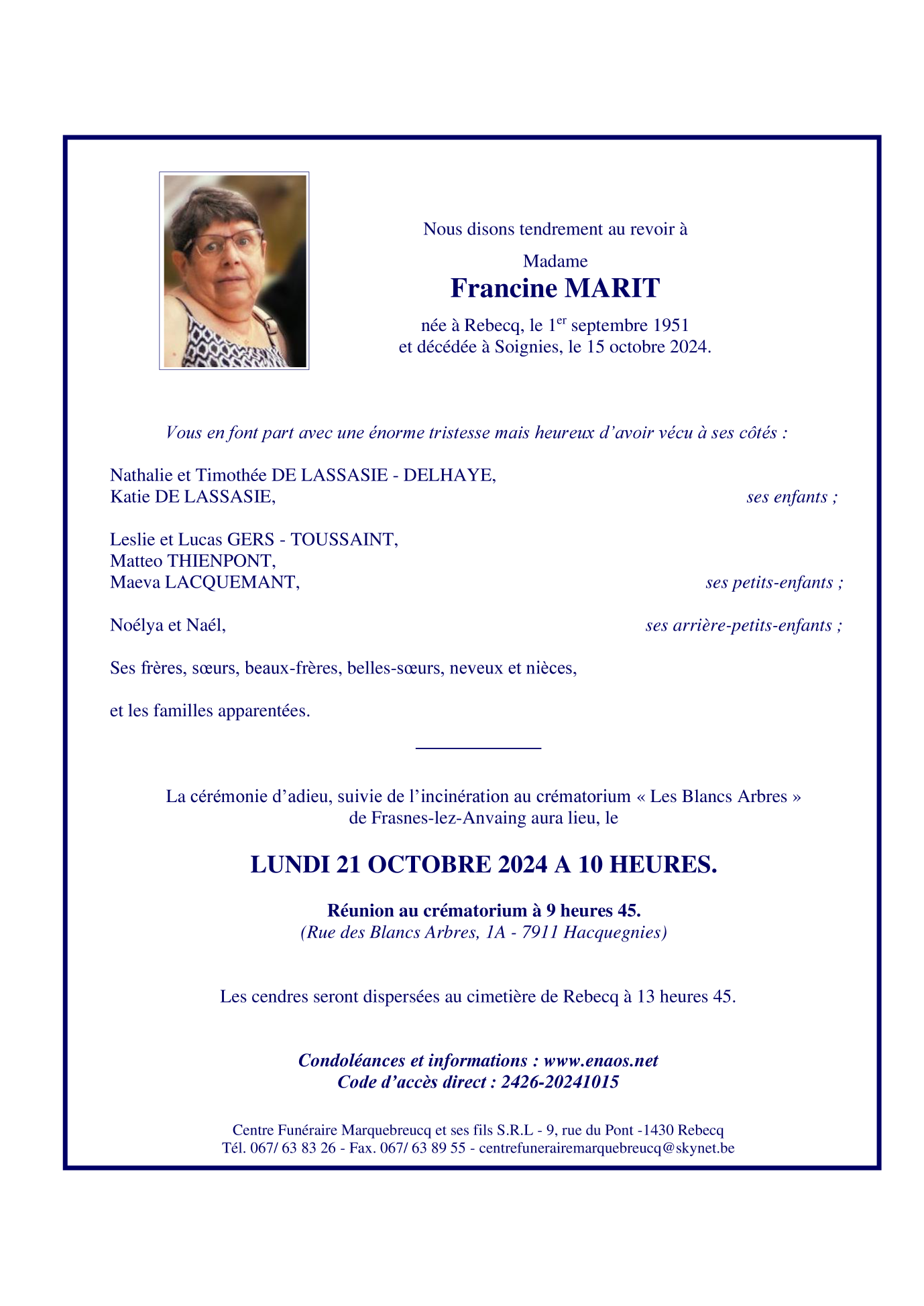 Décédée à Soignies (7060) le mardi 15 octobre 2024 à l'âge de 73 ans