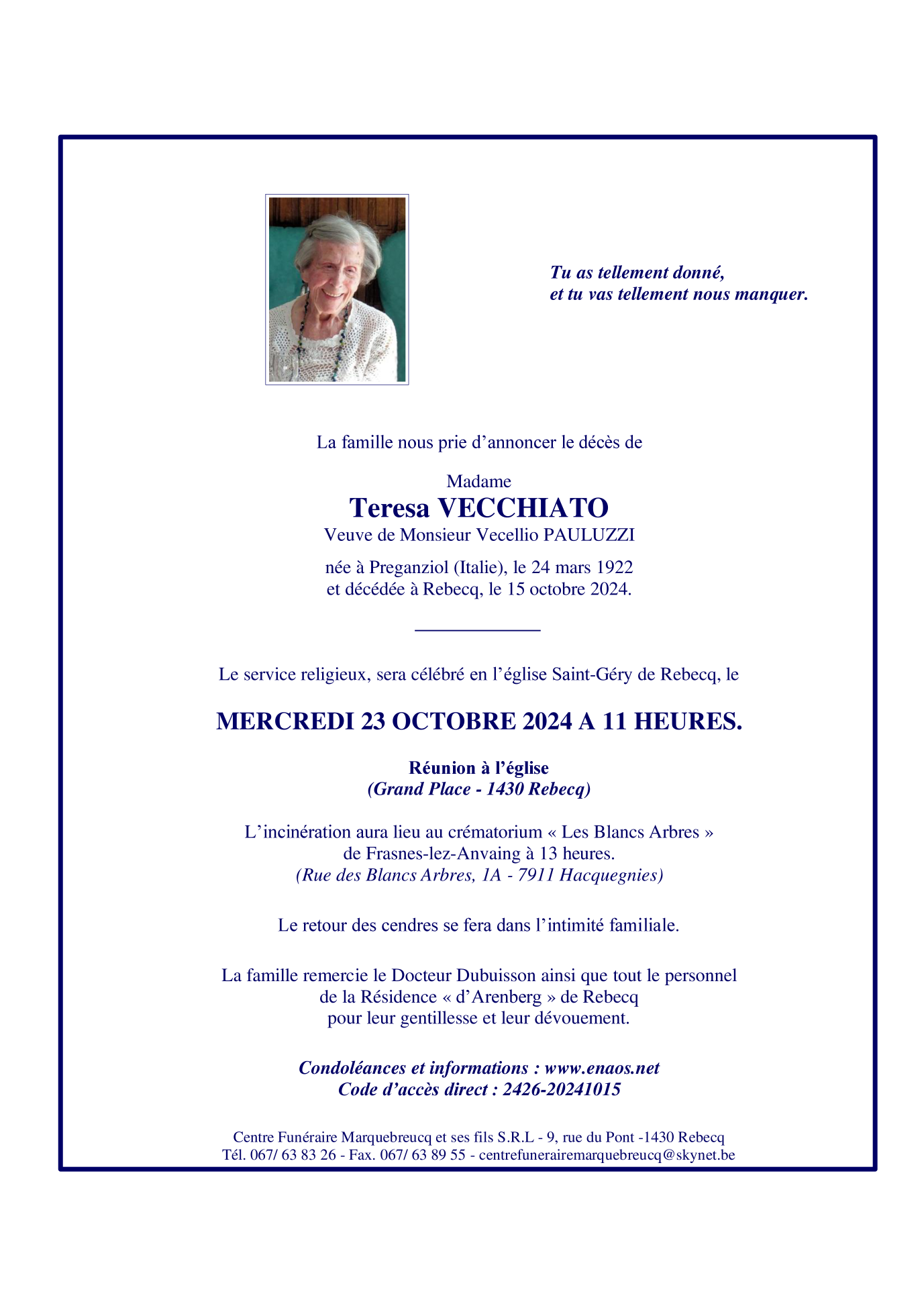 Décédée à Rebecq (1430) le mardi 15 octobre 2024 à l'âge de 102 ans